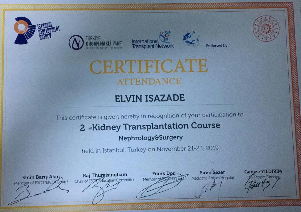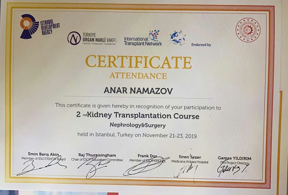 21-23 Noyabr 2019-cu il tarixdə Türkiyə Respublikasının İstanbul şəhərində “2nd Kidney Transplantation Course” adlı konfrans keçirildi. Kafedramızın 2 əməkdaşı baş laborant Tibb ü.f.d., Namazov A., baş laborant İsazadə E. bu konqresdə iştirak etmişdilər. Konfransda Böyrək transplantasiyası sahəsində müasir cərrahi yanaşmalar, immunosupressiya protokolları və digər mövzularda çıxışlar olmuşdur. Konfransa dünyanın bir çox ölkələrindən: Sudan, Nigeriya, Qana, İngiltərə, Hollandiya, Gürcüstan, İsveç kimi ölkələrindən cərrahlar və nefroloqlar qatılmışdır.