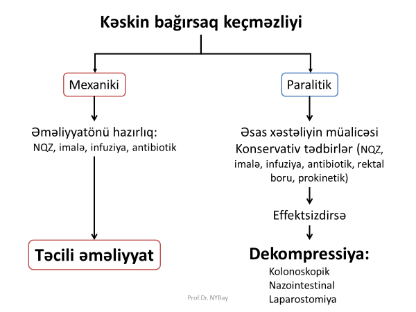 Müalicə cərrahidir. Maneənin, təsbit nöqtəsinin ləğvi, yan-yol (şuntlama) əməliyyatları yerinə yetirilməklə bağırsaq keçiriciliyi bərpa edilməlidir. Bağırsağın burulmuş, boğulmuş hissəsinin nekrozu (qanqrenası) radikal əməliyyatlara (həmin hissənin sağlam toxuma hüdudlarında rezeksiyası) mütləq gösərişdir. Əməliyyat bağırsağın dekompressiyası (enterostomiya, nazointestinal intubasiya) ilə tamamlanmalı, adekvat sanasiya və drenləşmə aparılmalıdır.