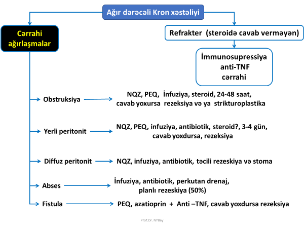 Müalicə. Crohn xəstəliyi və spesifik olmayan xoralı kolitin müalicəsinə oxşardır. 5-aminsalisil turşusunun sintetik preparatları (mesalazin, salofalk), təbii prebiotik preparatlar (mukofalk, zakofalk) və sulfanilamidlər (sulfasalazin, sulfapiridin), ikincili bakterial çirklənmənin eradikasiyası üçün antibiotikoterapia, diareyanın azaldılması üçün xolestiramin, simptomatik və dəstək (nutrision) müalicəsi tövsiyə olunur. Orta ağır və ağır dərəcəli zədələnmələrdə müalicənin steroid preparatları (prednizolon, deksametazon) ilə başlanması məqsədəuyğun hesab edilir.
