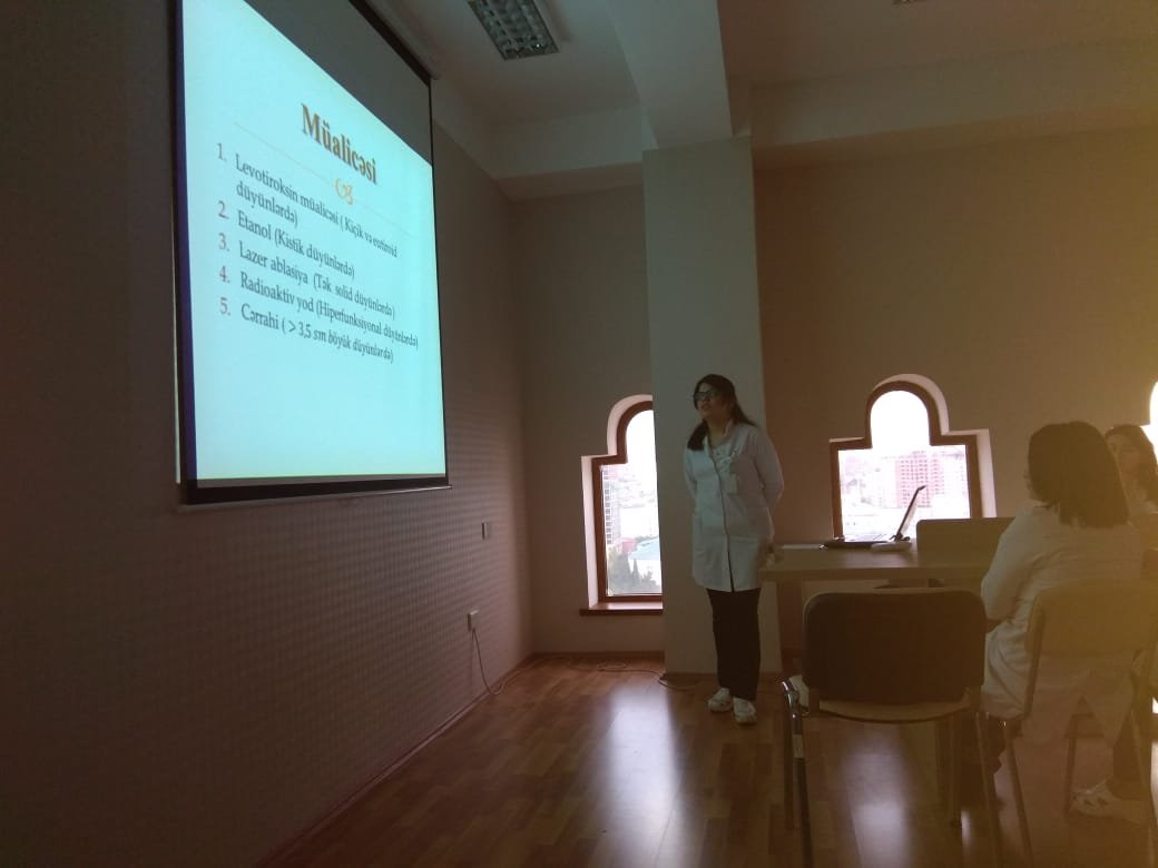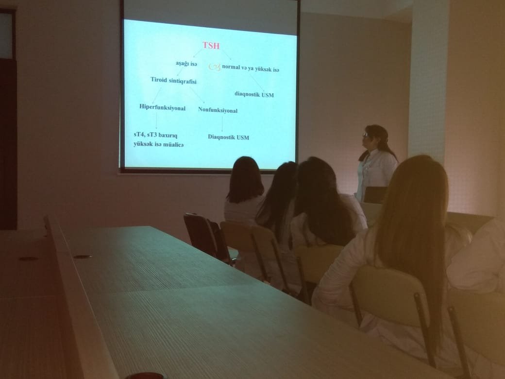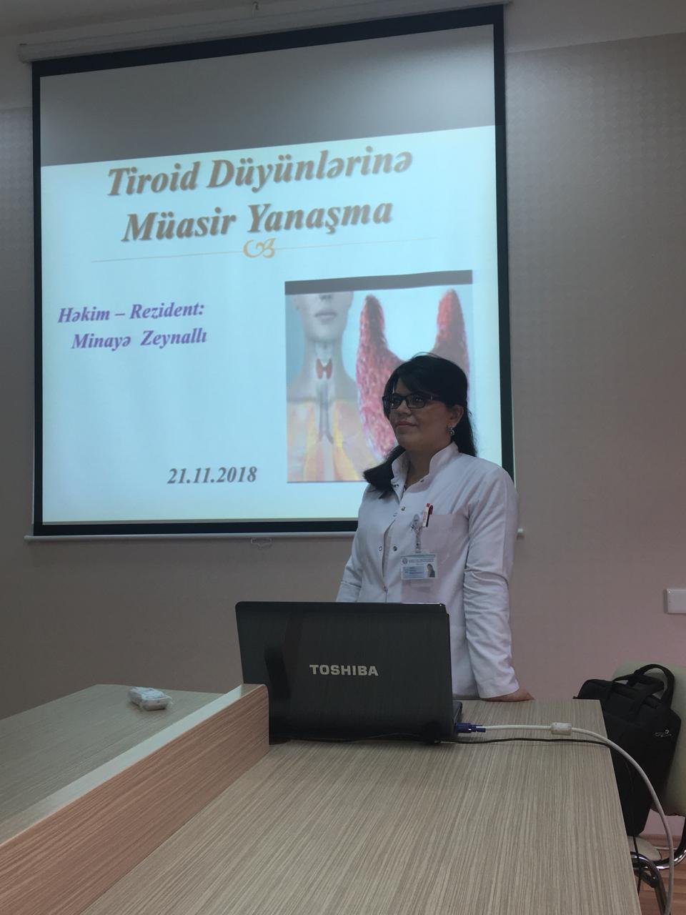 21.11.2018 tarixində I Cərrahi xəstəliklər kafedrasının V kurs rezidenti Zeynallı Minayə “ Tiroid düyünlərinə müasir yanaşma” mövzusunda seminar çıxışı oldu. Çıxışda Cərrahi xəstəliklər kafedrasının rezidentləri ilə yanaşı digər kafedraların rezidentləri, tələbə və müəllimlər də iştirak etdi. Seminarda Tiroid düyünlərinin diaqnostikasında USM – in əhəmiyyəti, Ti RADS (2017) təsnifatı, İİAB – nin (İncə İynə Aspirasiyon Biopsiya)üstünlükləri, Bethesda təsnifatı haqda məlumat verildi. Həmçinin digər müasir müayinə üsulları və müalicəsi geniş müzakirə olundu. Mövzu ilə bağlı rezident və tələbələrin sualları cavablandırıldı.