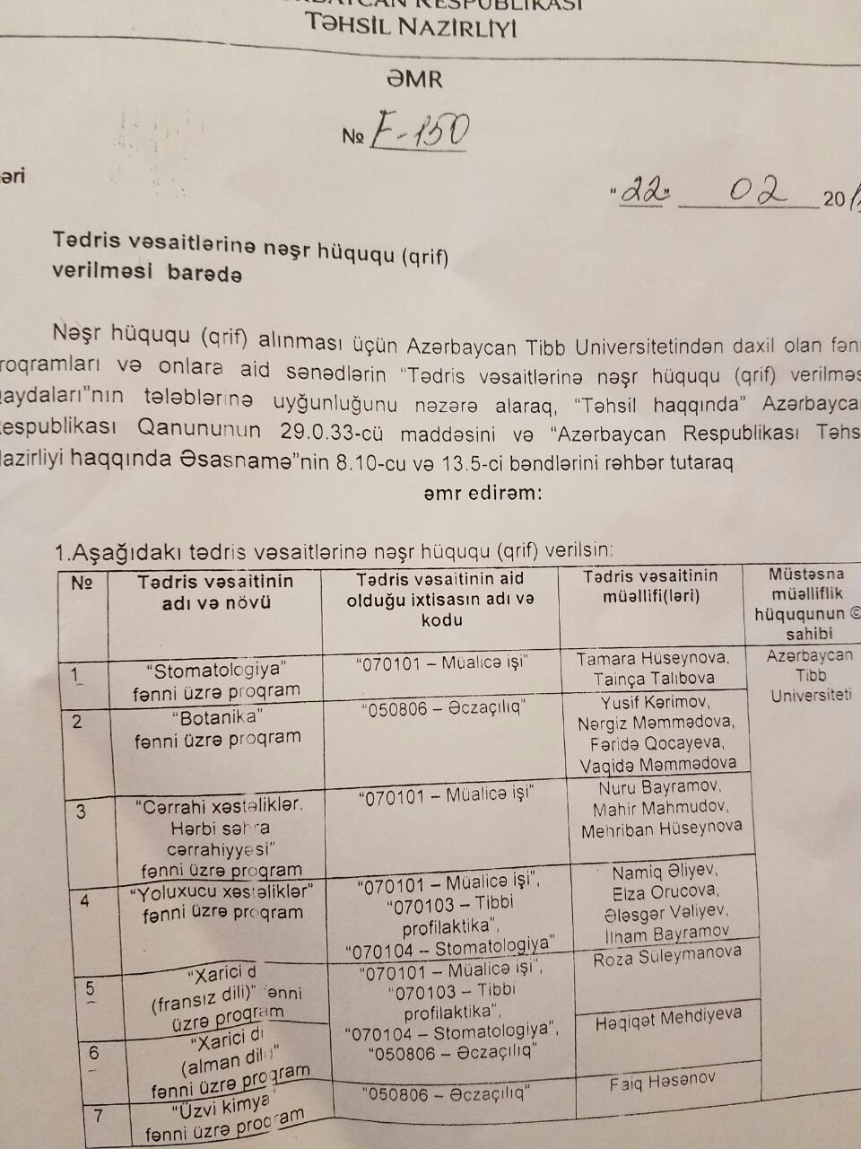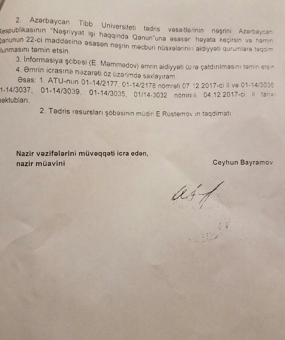 AMEA-nın müxbir üzvü, professor N.Y.Bayramovun rəhbərliyi altında ATU-nun I müalicə-profilaktika fakultəsi üçün yazılmış Cərrahi xəstəliklər. Hərbi səhra cərrahiyyəsi fənni üzrə tədris proqramına Təhsil Nazirliyi tərəfindən nəşr hüququ (qrif) verildi